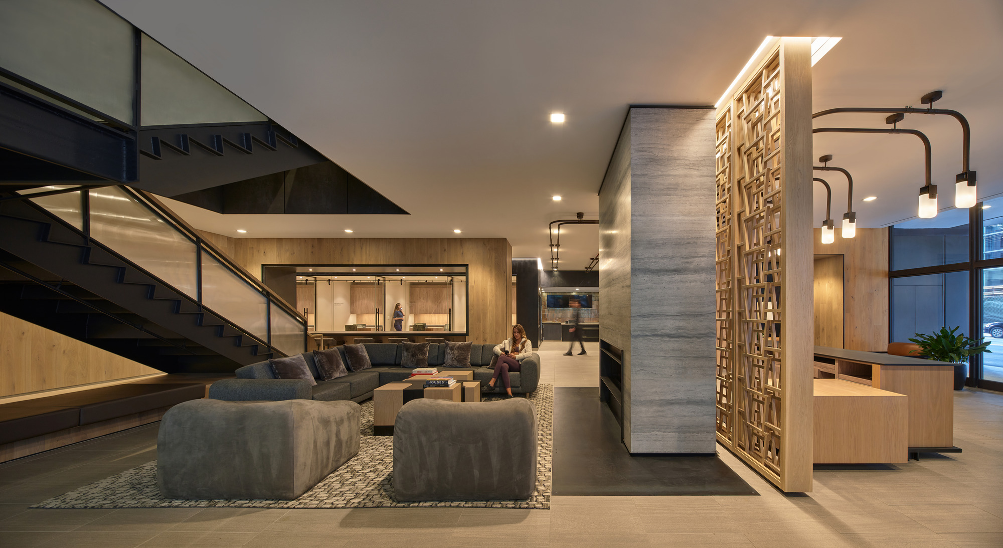 The design prioritized the articulation of the club’s ‘social spaces’ through the introduction of custom crafted elements; from handmade to machine fabricated features. The entry sequence highlights a dynamic tri-layer, white oak wood screen that defines the concierge and the tech lounge beyond. The depth effect of the multi layered screen is achieved by computer numerical control (CNC) fabrication technique to carve the solid wood panels into a dynamic spatial pattern.