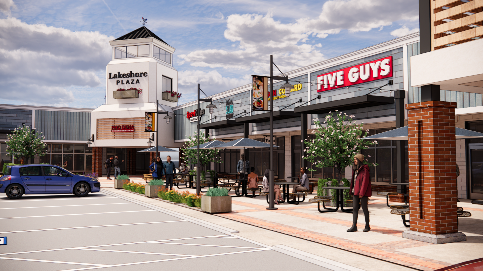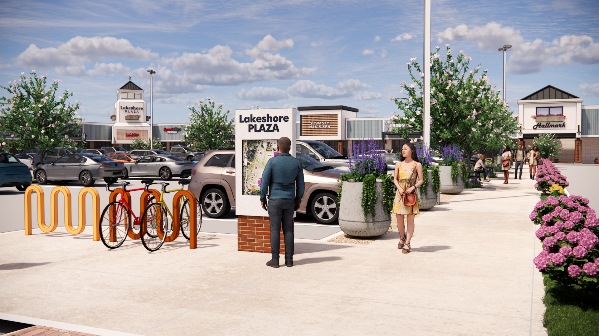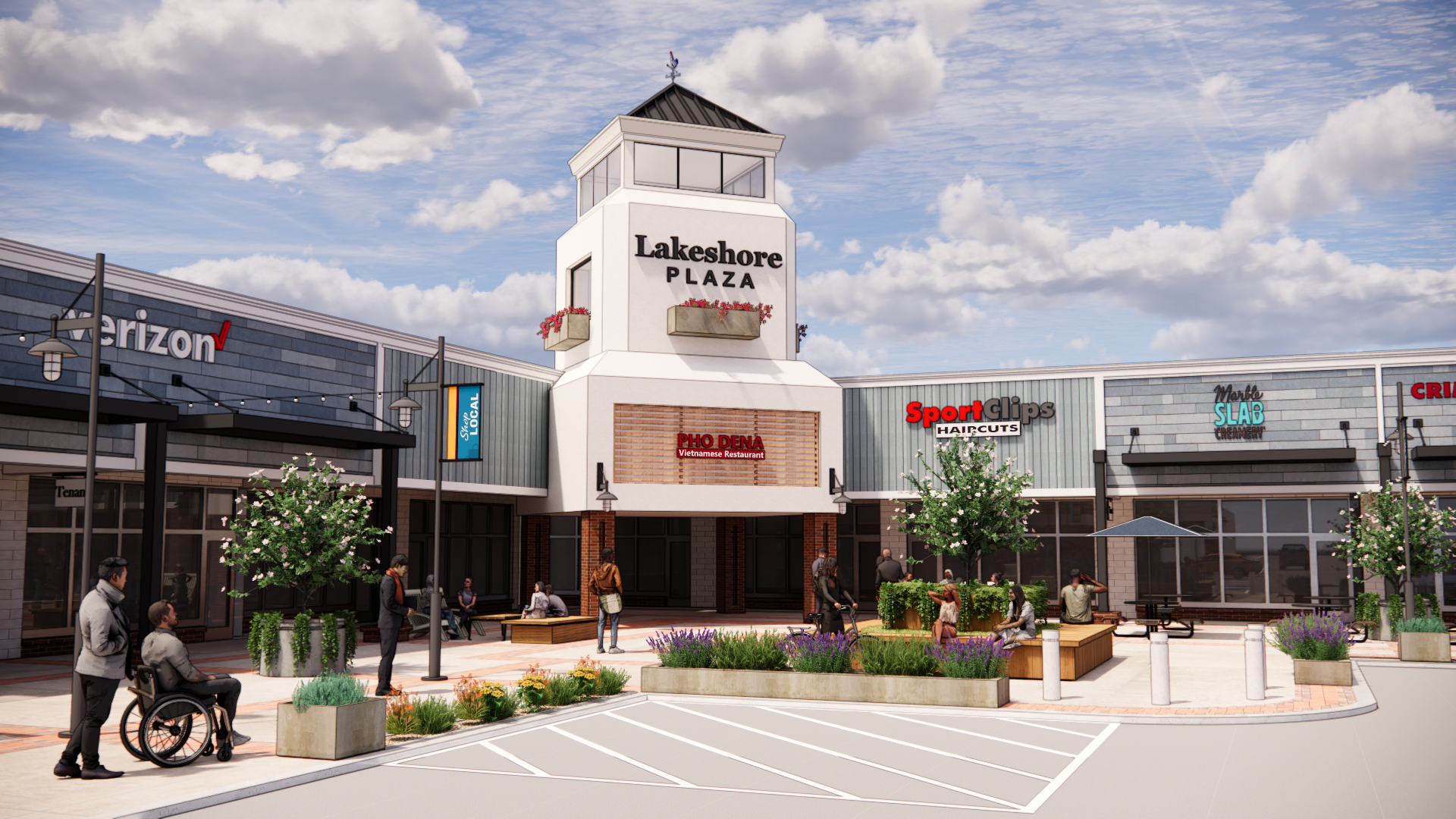 The Lakeshore Plaza renovation includes strategic interventions to prepare the center for a successful repositioning. The project emphasizes connectivity, pedestrian safety, and overall accessibility to create an engaging and welcoming retail destination for the community. Site improvements include enhanced landscaping, clear wayfinding, improved pedestrian pathways, and thoughtfully designed placemaking amenities such as casual dining and lounge areas. Façade enhancements feature new finishes and tower designs, creating a dynamic and varied experience that allows each tenant to express their distinct identity.