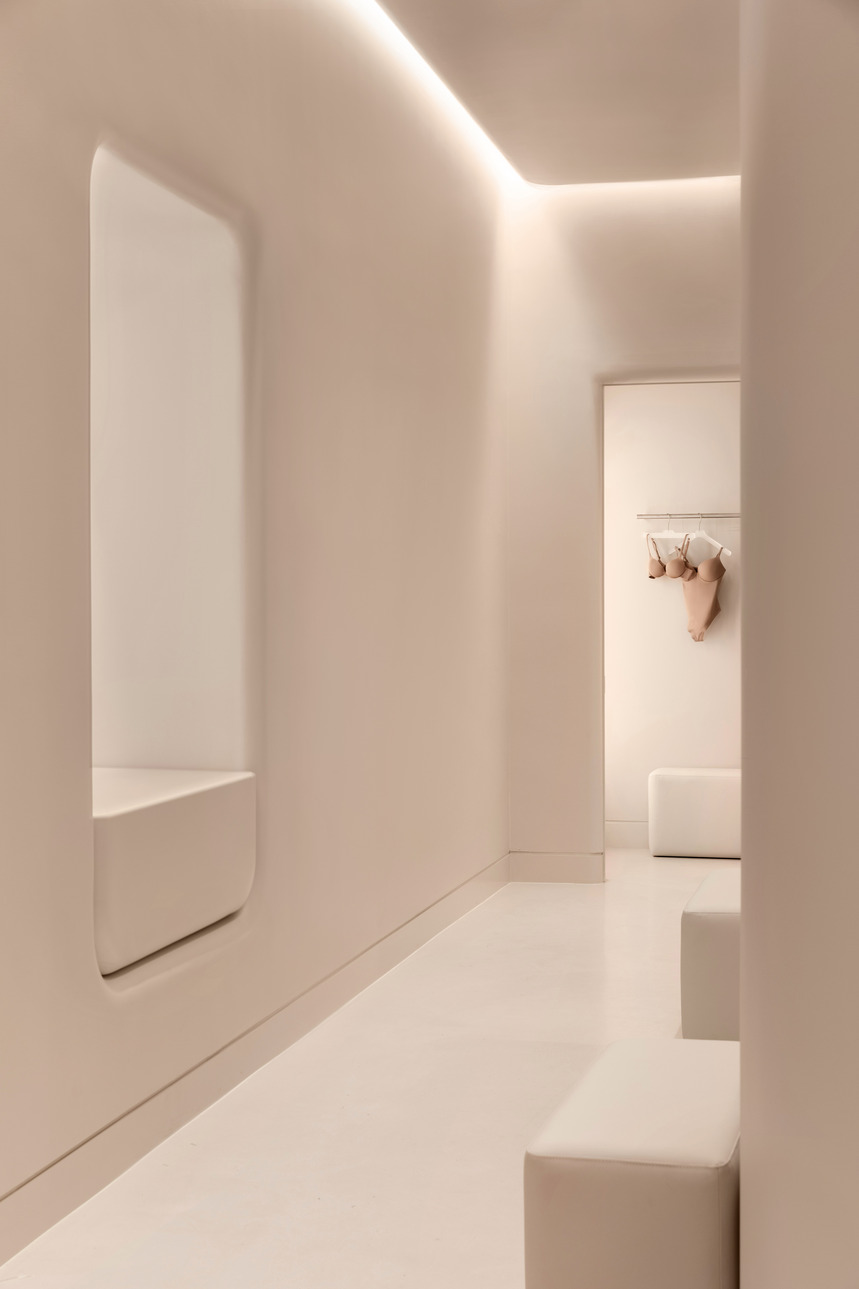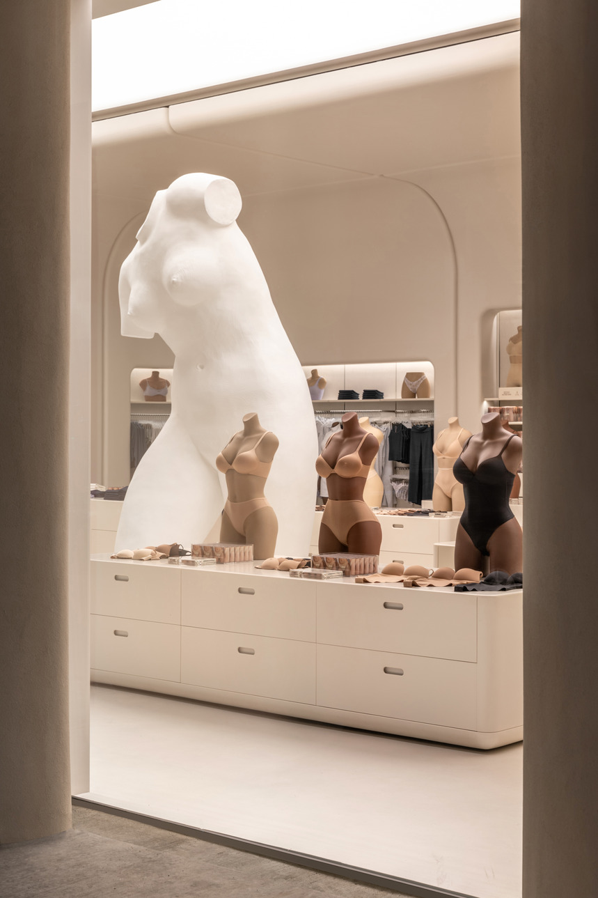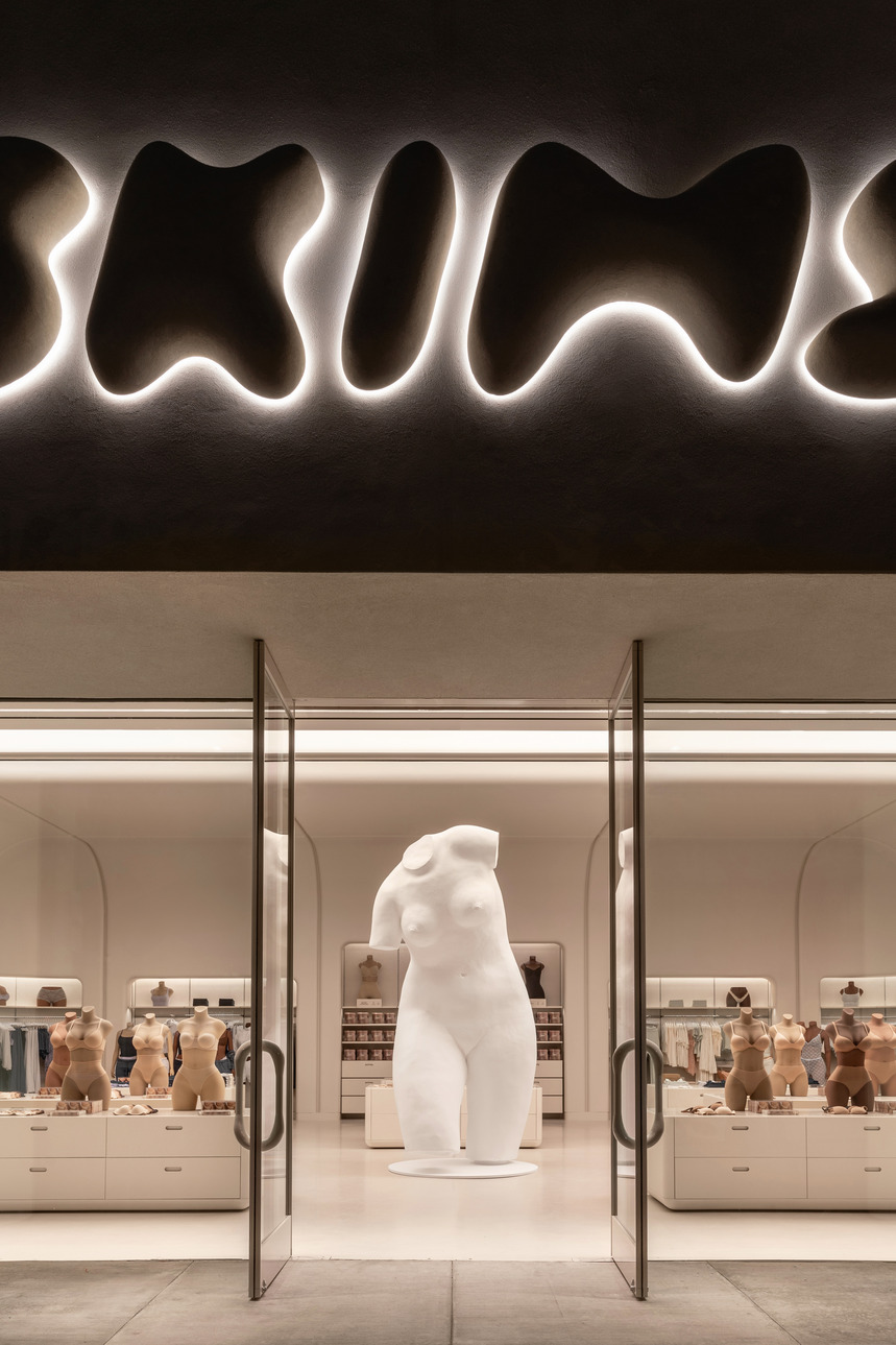 The 4,546-square-foot boutique reflects SKIMS’ signature skin-tone palette and sleek aesthetic. A 12-foot sculpture by Italian contemporary artist Vanessa Beecroft greets guests as they step into the store, which features the full range of SKIMS collections—including shapewear, loungewear, underwear, accessories, and more.
